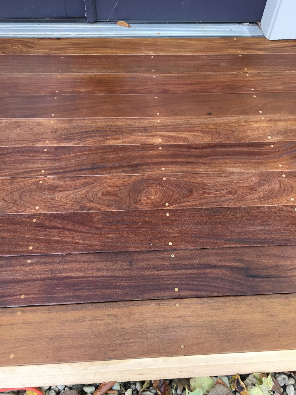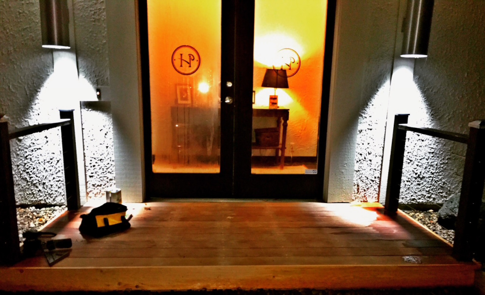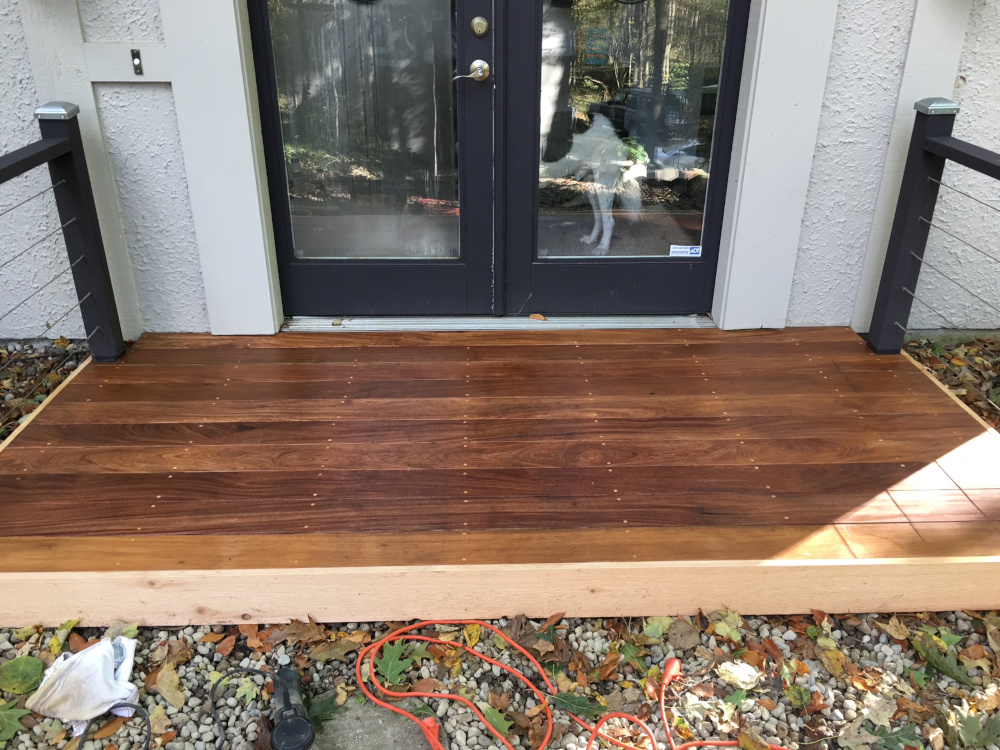 Front deck project. We buried some 4×4’s, framed up the deck, added Feeney Architectural stainless steel cable system and then decked it with Cumaru wood. Cumaru is a Brazilian hardwood that stands up to the elements. It is super dense and difficult to work with, (or at least the drill bits tell us that.) We then bunged the screw holes for some accent.