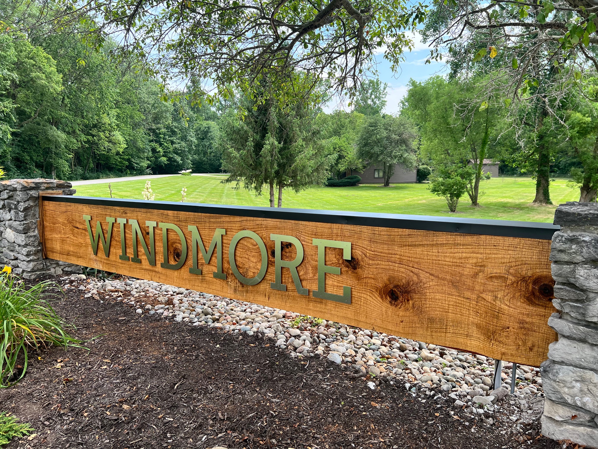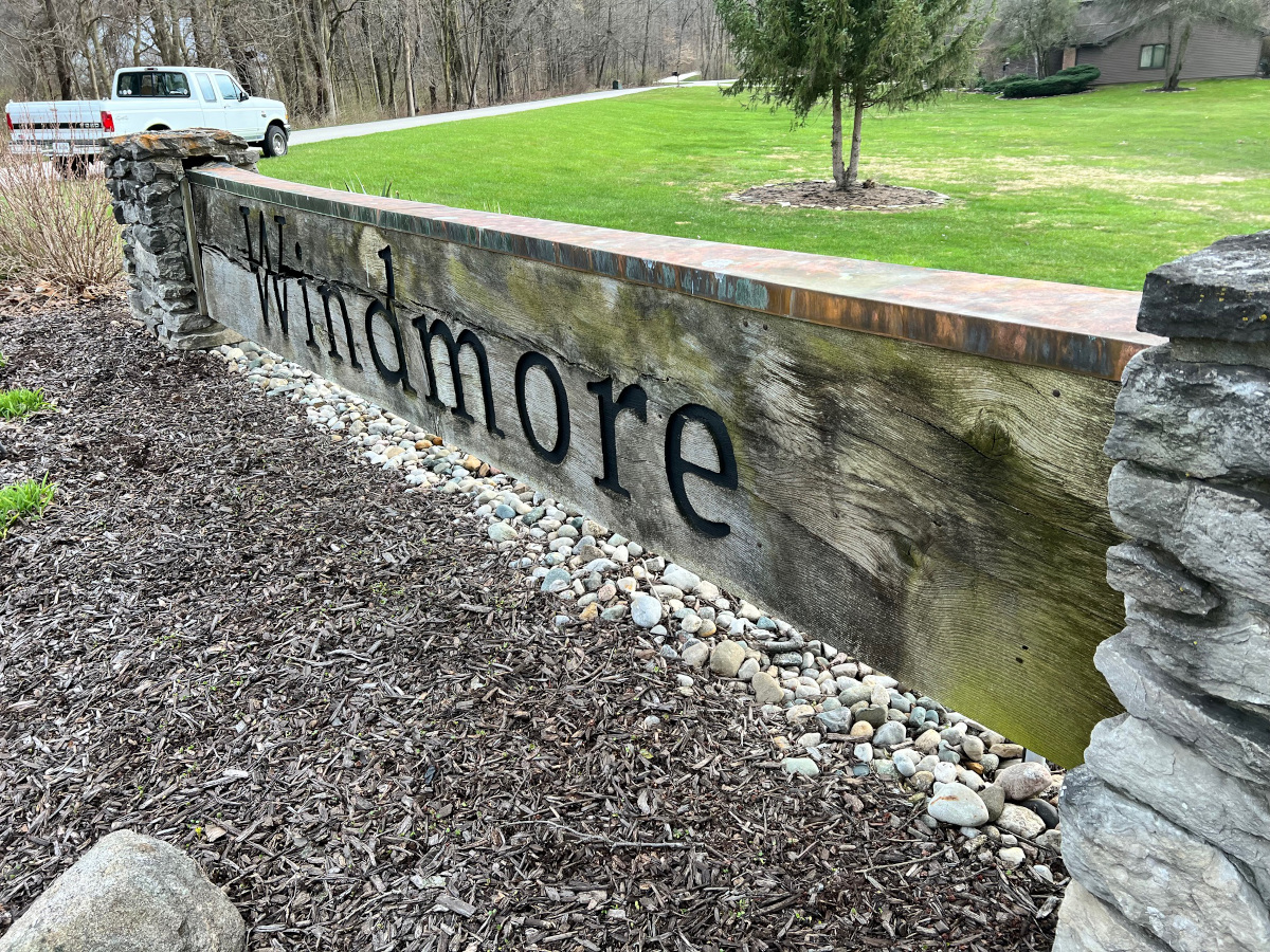 This project was fun! When you are dealing with a slab of oak that is 19 feet long, 8 inches thick and 30 inches tall, it is always a challenge to get it set back into the existing masonry columns. We found a mill to fabricate the large piece of oak, then added the aluminum cap, lettering and some nice solar lighting to give it a little glow at night time.