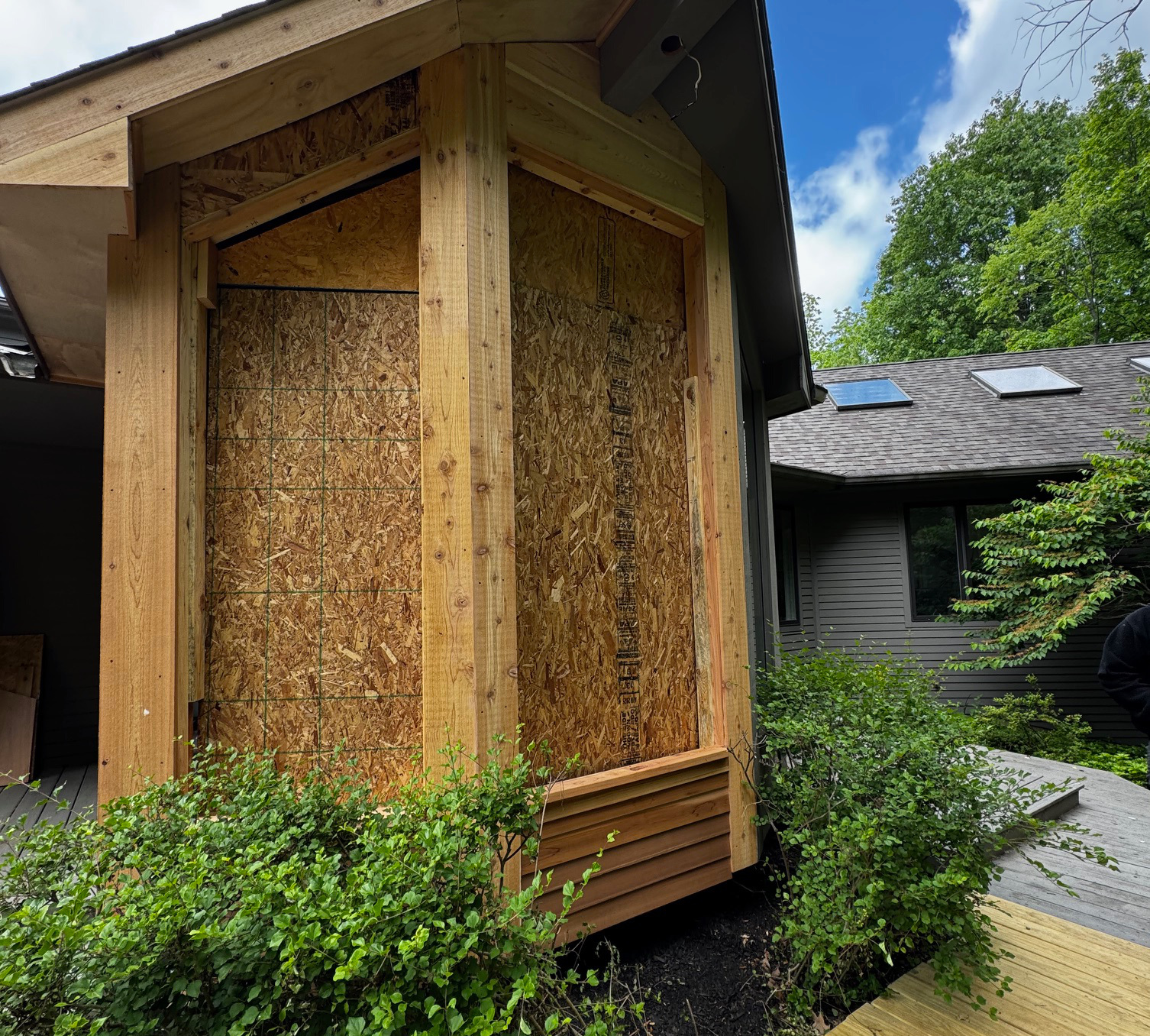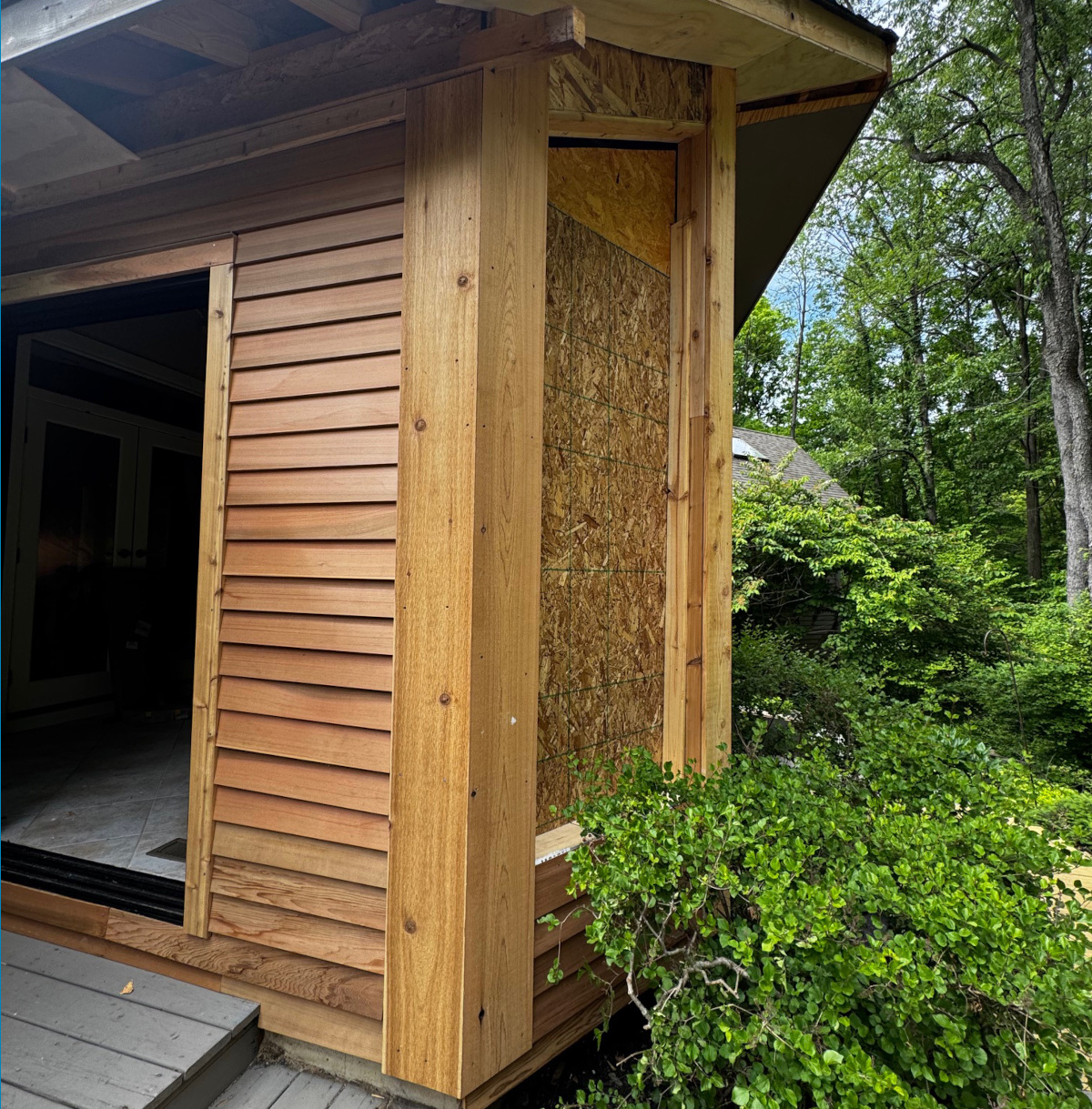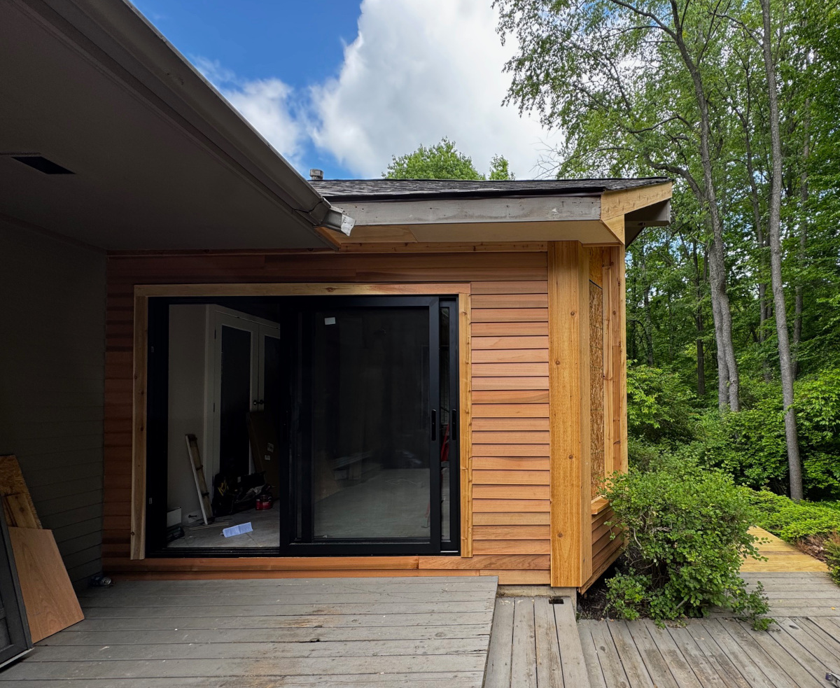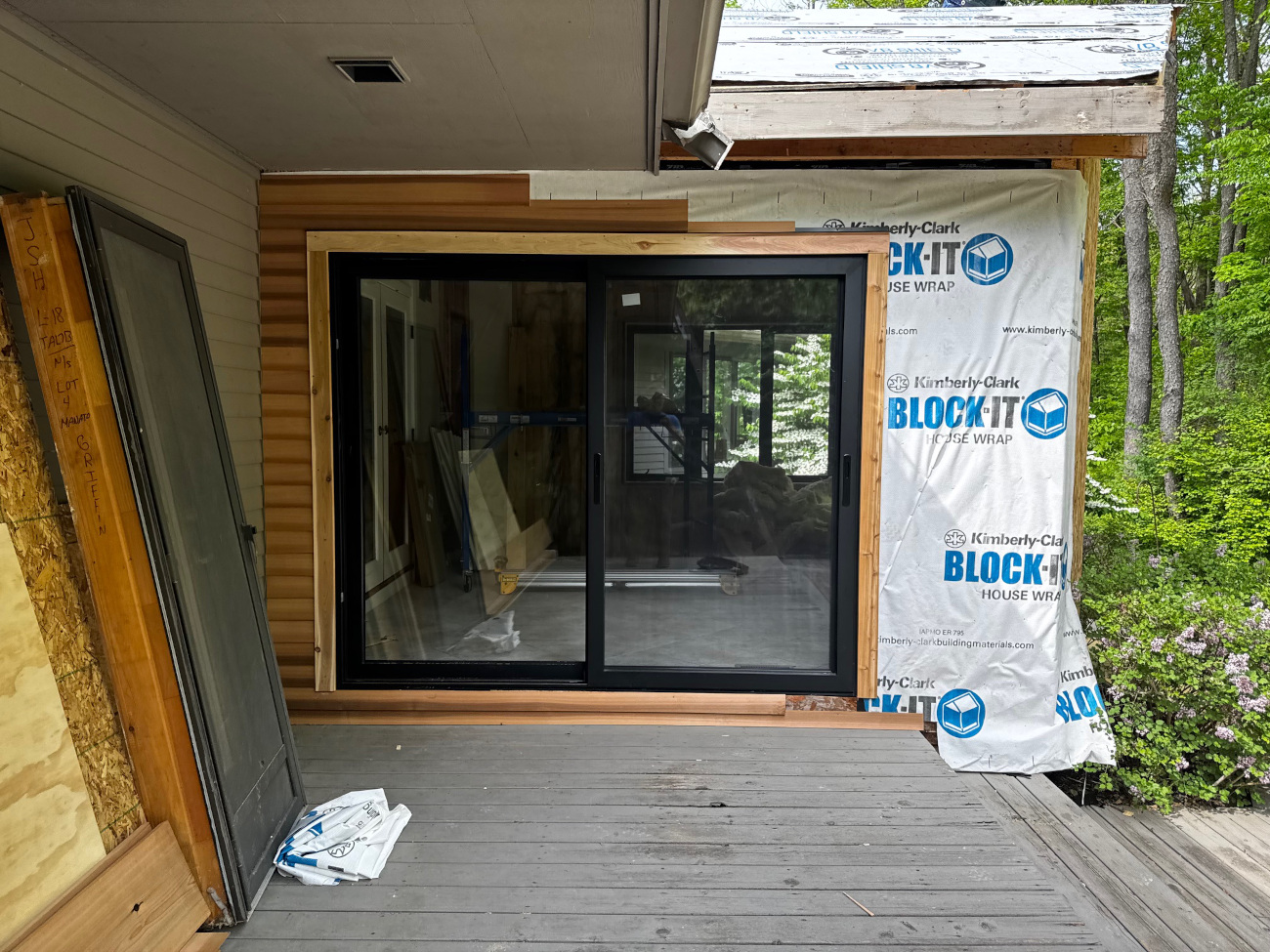 This project was to install new beautiful cedar siding, trimming out exterior windows and doors. We also set a new 3-way sliding door and set new fixed glass panels on the boats bow end of the room.